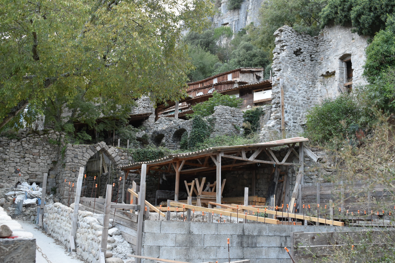 Lieu insolite accessible uniquement à pied en suivant un sentier le long de l'Ardeche depuis Balazuc, Ancien village surplombant l'Ardèche et accote aux falaises, abandonné au début du 20 ème siècle et reconstruit par des bénévoles dans les années 70 et toujours en évolution, avec sa ferme ses chèvres , ses cochons, son restaurant avec d'excellentes tartines , ses produits locaux et une serveuse aussi jolie que souriante. Lily j'ai cru entendre !
